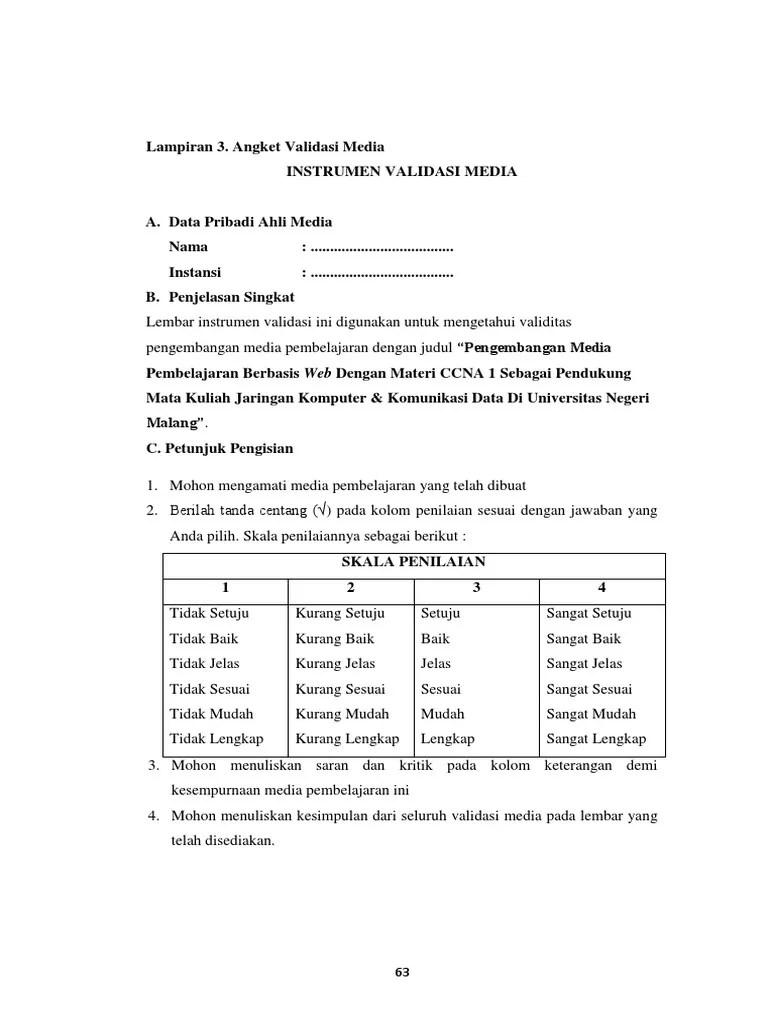 Media pembelajaran berbasis game edukasi dengan adobe flash pada lampiran 3. Berdasarkan hasil penilaian ahli materi, ahli media dan peserta didik sebagai uji coba produk media pembelajaran berbasis multimedia interaktif dengan . Instrumen penelitian diberikan kepada ahli media, ahli materi, dan responden untuk menguji kelayakan produk media pembelajaran. Yang digunakan adalah instrumen validasi ahli. Diolah dari hasil angket penilaian validasi ahli materi. Pembelajaran matematika pada materi bangun ruang. Ahli materi ahli materi yang dimaksud adalah dosen/pakar yang berkompeten dalam menguji materi dari media yang dikembangkan. Penilaian oleh ahli materi terdiri dari 3 aspek yakni umum, pembelajaran, dan substansi materi. Instrumen penilaian berupa angket respon siswa, instrumen validasi ahli media dan ahli materi, dan angket respon guru. Terdapat tes yang bisa digunakan sebagai dasar menilai hasil belajar siswa. Pengembangan augmented reality book sebagai media. Lembar validasi untuk ahli materi. 1 lampiran b angket validasi ahli media angket validasi ahli materi angket penilaian siswa angket tambahan penilaian sis.